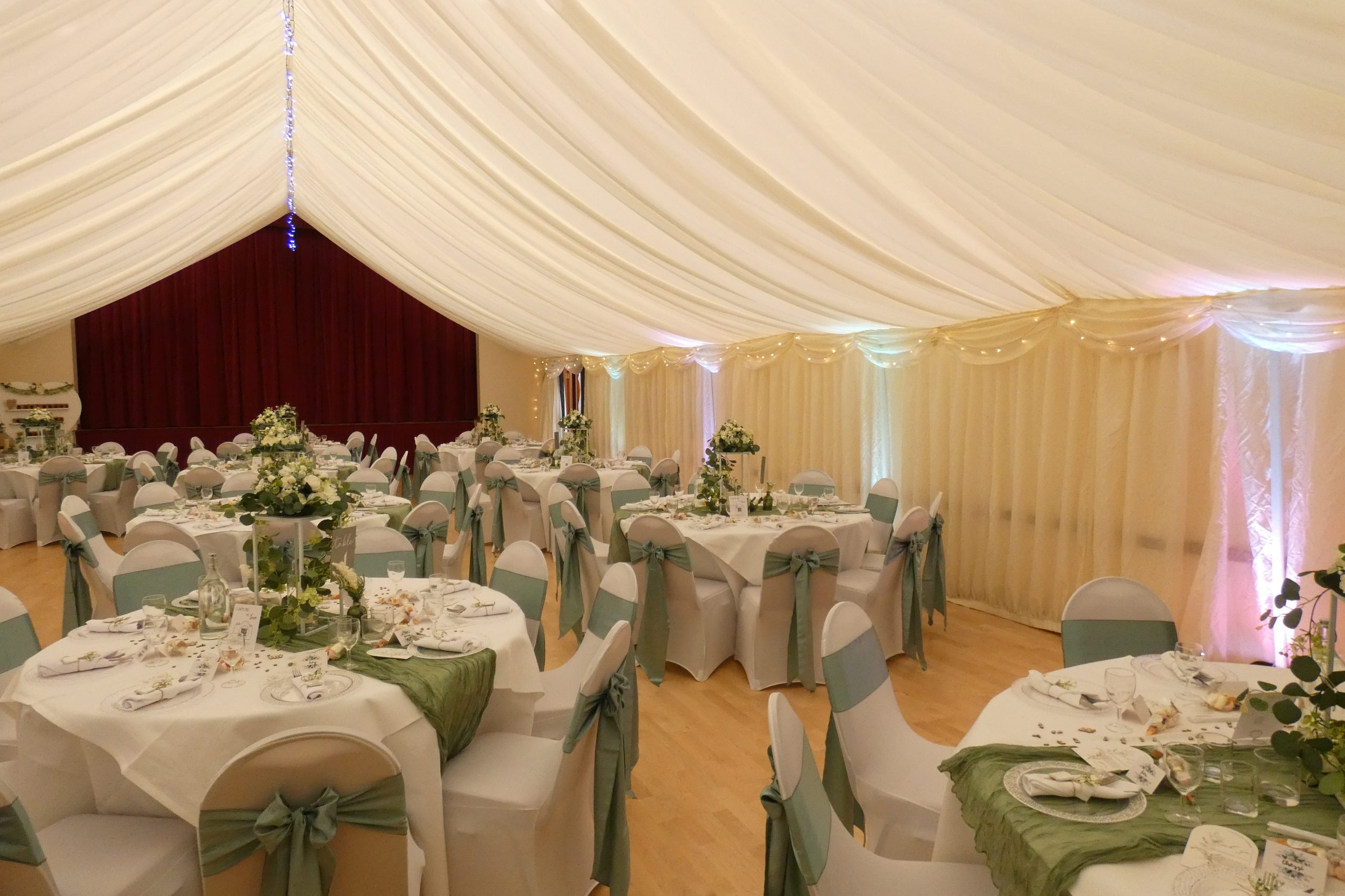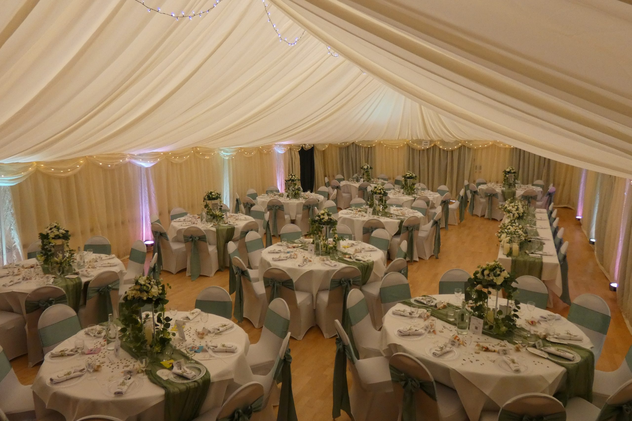 Our internal marque is ivory white and we use LED uplighters to colour coordinate your wedding theme. A star burst is projected onto the roof lining to complete a stunning look.